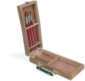 La esta cubierta de caja puede sostener 4 cepillos. La base tiene compartimientos para almacenar los tubos de las pinturas, los pasteles, el etc. Ofrece una manija de cuero para llevar fácil.
